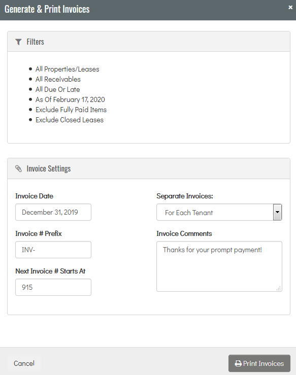 Group any combination of receivables onto a single invoice, and split invoices for each tenant, for each tenant & payment type, for each amount due, or all items on a single a invoice. Adjust the invoice date as required, customize your invoice numbers and special prefixes, and add invoice comments.